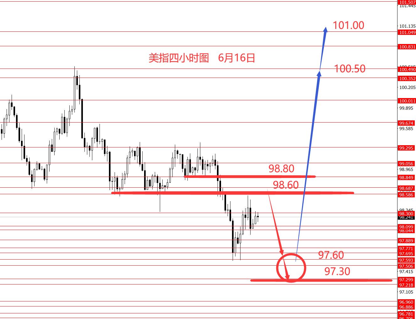 上周美指实际走势跌破98.30,上周分析错误。从图形来看,美指继续下跌并创新低,本周上方重点关注98.80区域强阻力,以下还是偏空头,但也要留意转向行情的出现,因为节奏分析,97.30没跌破前,波段仍然偏向于看涨,故本周操作思路:谨慎做空或观望不操作。周初先关注98.60和98.80一线强阻力。框架思路仅供参考,风险自负。