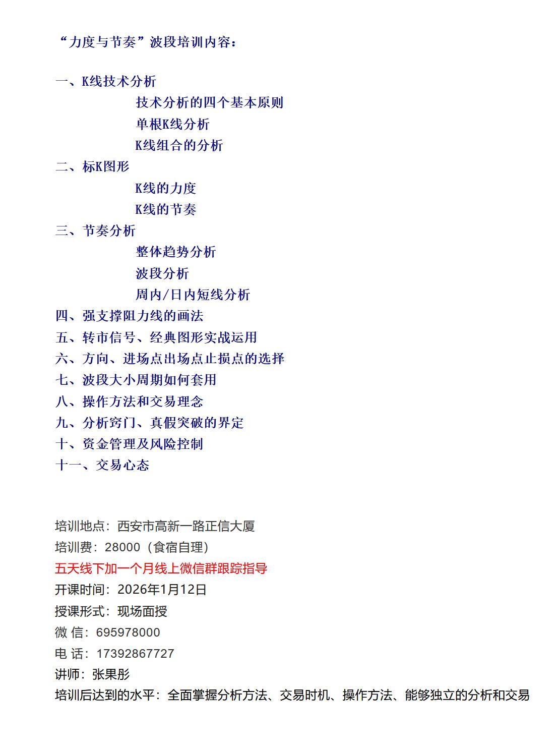 “K线形态”日内短线培训班12月15日开课,下下期开课2月9号。“节奏与力度”波段大课,下期开课时间1月12日。