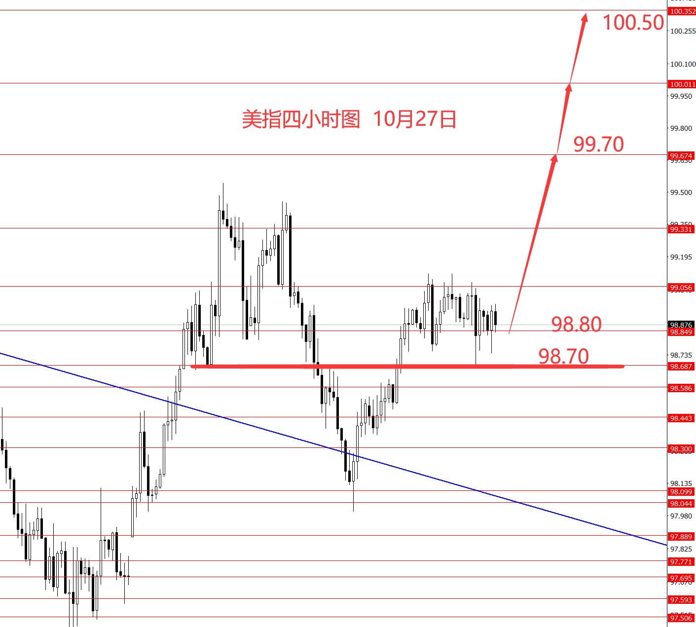 美指上周正如预期向上运行,周图收阳柱。从图形来看,中线波段继续看涨,本周初关注98.70强支撑,以上继续看涨,目标101和102.40区域,上周框架思路延用即可。本周操作建议:98.80/98.70附近做多,止损98.40,目标看向99.70和100.50和101.0附近。控制仓量,严格止损。