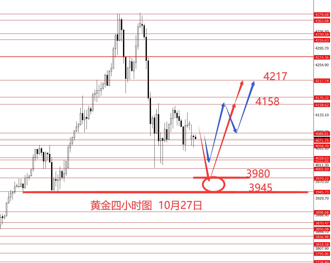 黄金上周文字稿件点位卡的没错,4380没创新高,向下运行,4088也一步到位。配图点位不对。本周黄金继续区间震荡的概率较大些,但也要留意月线收盘前的反弹行情。本周初先关注上方4160区域的强阻力,目前四小时图越来越收窄,震荡偏空头,下方关注3980和3945两个强支撑,留意反弹行情出现。今日只有框架思路,因止损太大没法给具体操作策略。
