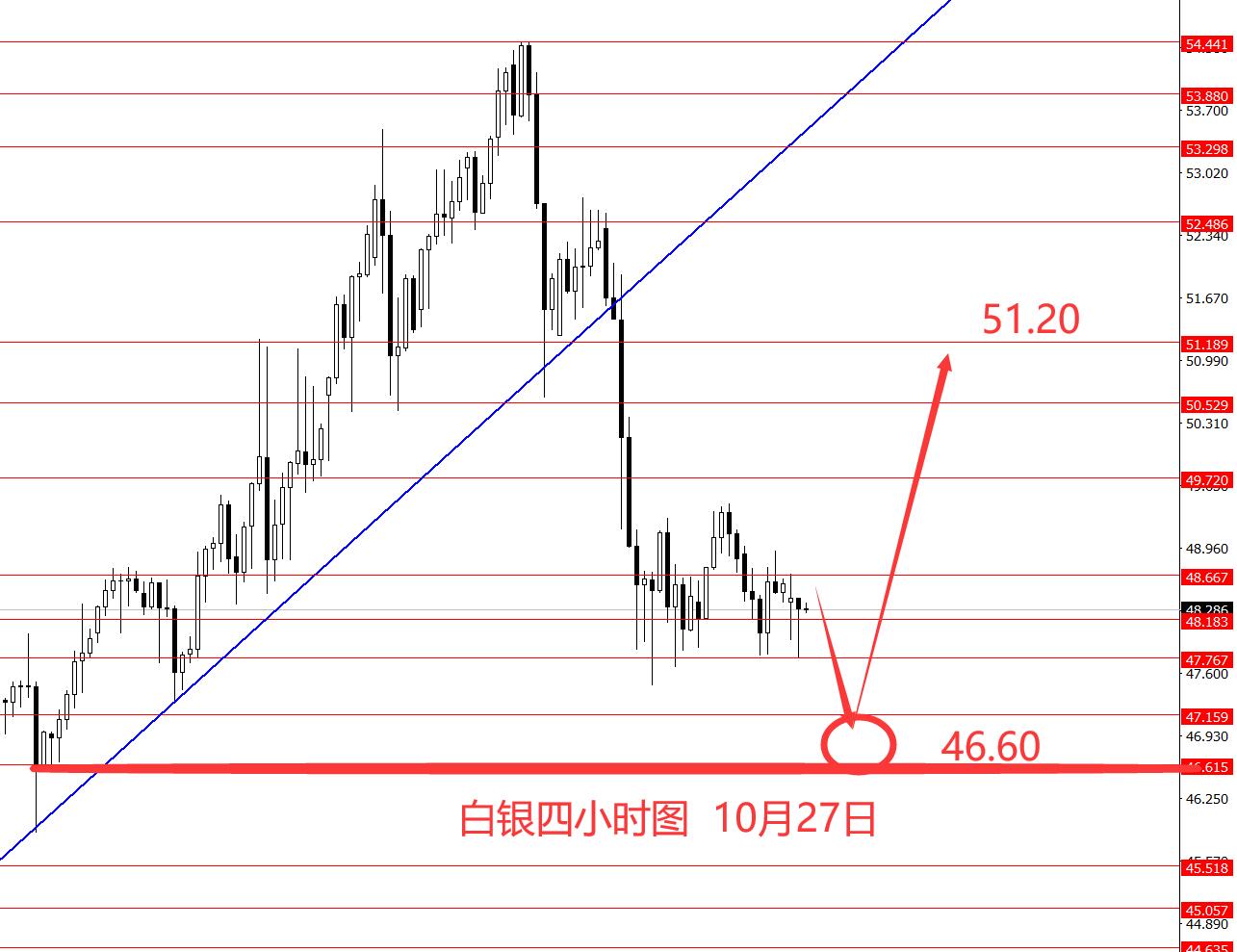 白银上周正如预期,大幅下跌目标价48.70也已到位。从图形来看,本周区间震荡概率较大些,区间关注46.60-51.20,留意白银本周创新低后的反弹行情。四小时图49.70没上破前,建议按区间震荡偏空头操作,本周创新低后,再企稳反弹上行的概率较大些,今日只有框架思路,没有具体操作建议,框架思路仅供参考吧。