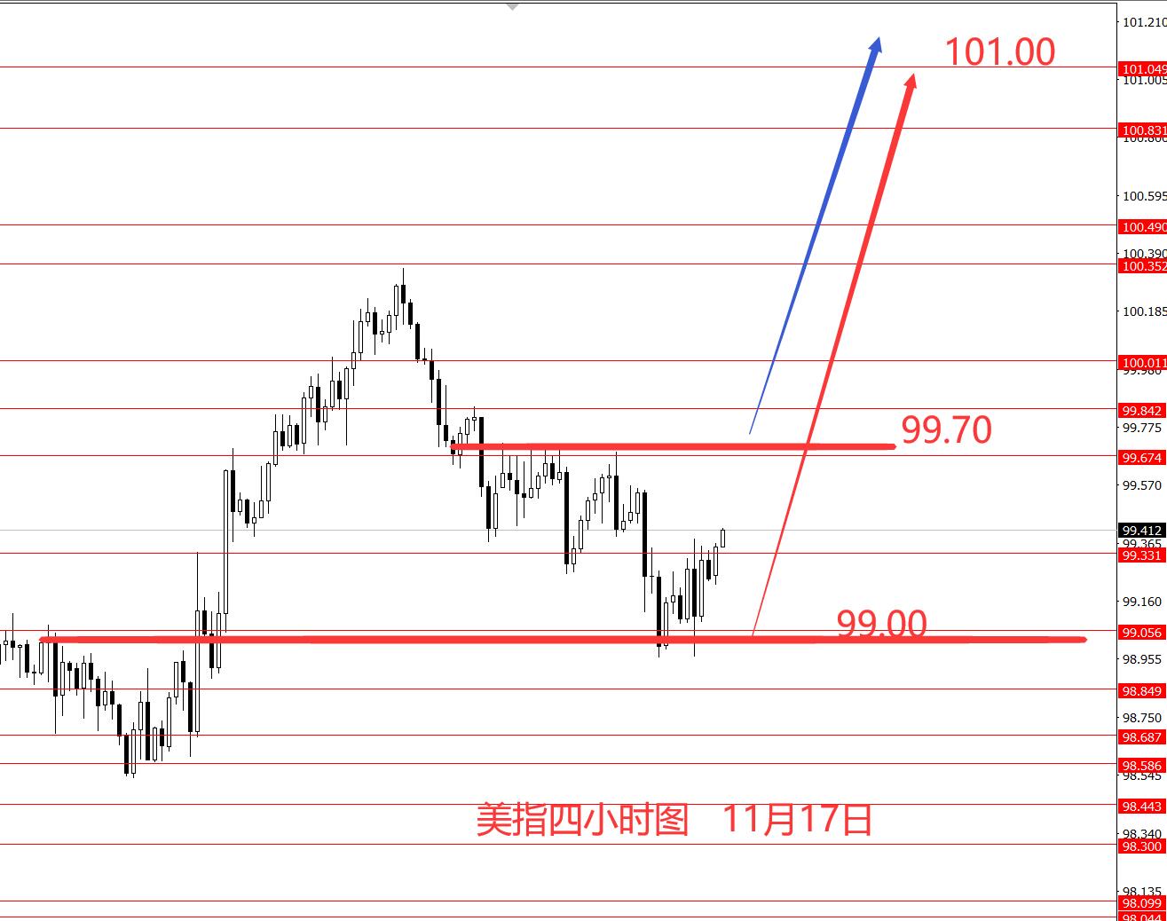 美指前两周向下回调,但99.00区域强支撑仍然没破,所以前期框架思路延用即可,后市继续中线看涨美指至101.70和102.40区域。本周下方仍然关注99.00一线强支撑,以上继续偏向于看涨,四小时级别,上方可关注99.70强阻力,在没成功上破前,本周二次探底测试99.00的概率相对较大些,若直接站稳了99.70上方,则二次探底的概率将减小,直接拉涨的概率将加大。先抓红线,蓝线备选。本周操作建议:99.00附近做多,止损98.55,目标看向101和101.70和102.40区域。控制仓量,严格止损。