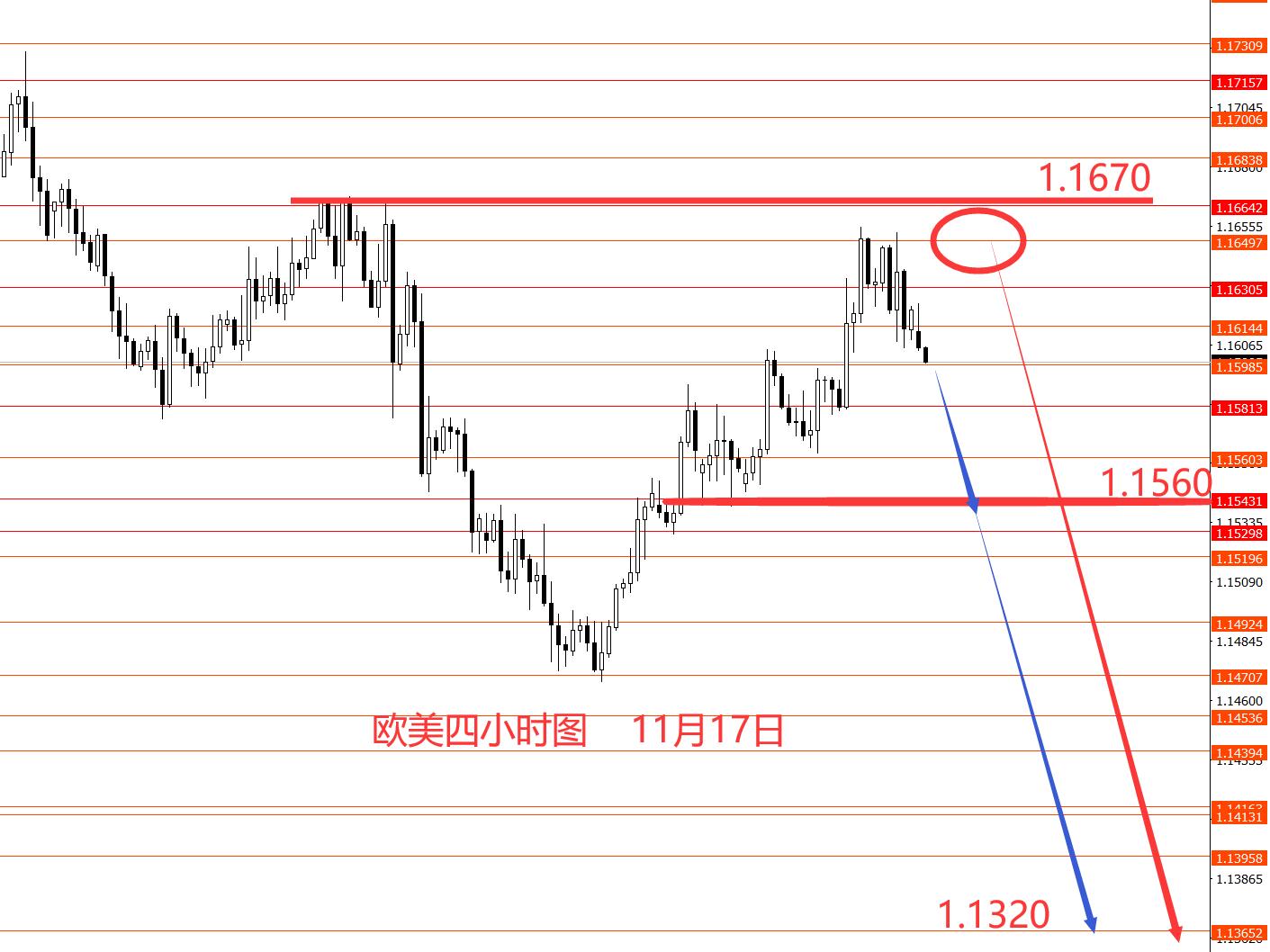欧元前两周一直在反弹上行,最高1.1650区域,反弹超预期。从图形来看,反弹虽超预期1.1600,但图形框架没有走坏,本周关注上方1.1670区域强阻力,以下还是波段性看空,目标仍是1.1320和1.1080区域。本周初先关注下方1.1560强支撑,以上二次探顶的概率相对较大些,若直接跌破则概率减小。今日只有框架思路,没有具体操作建议。建议按红线抓高空行情,蓝线为备选方案。