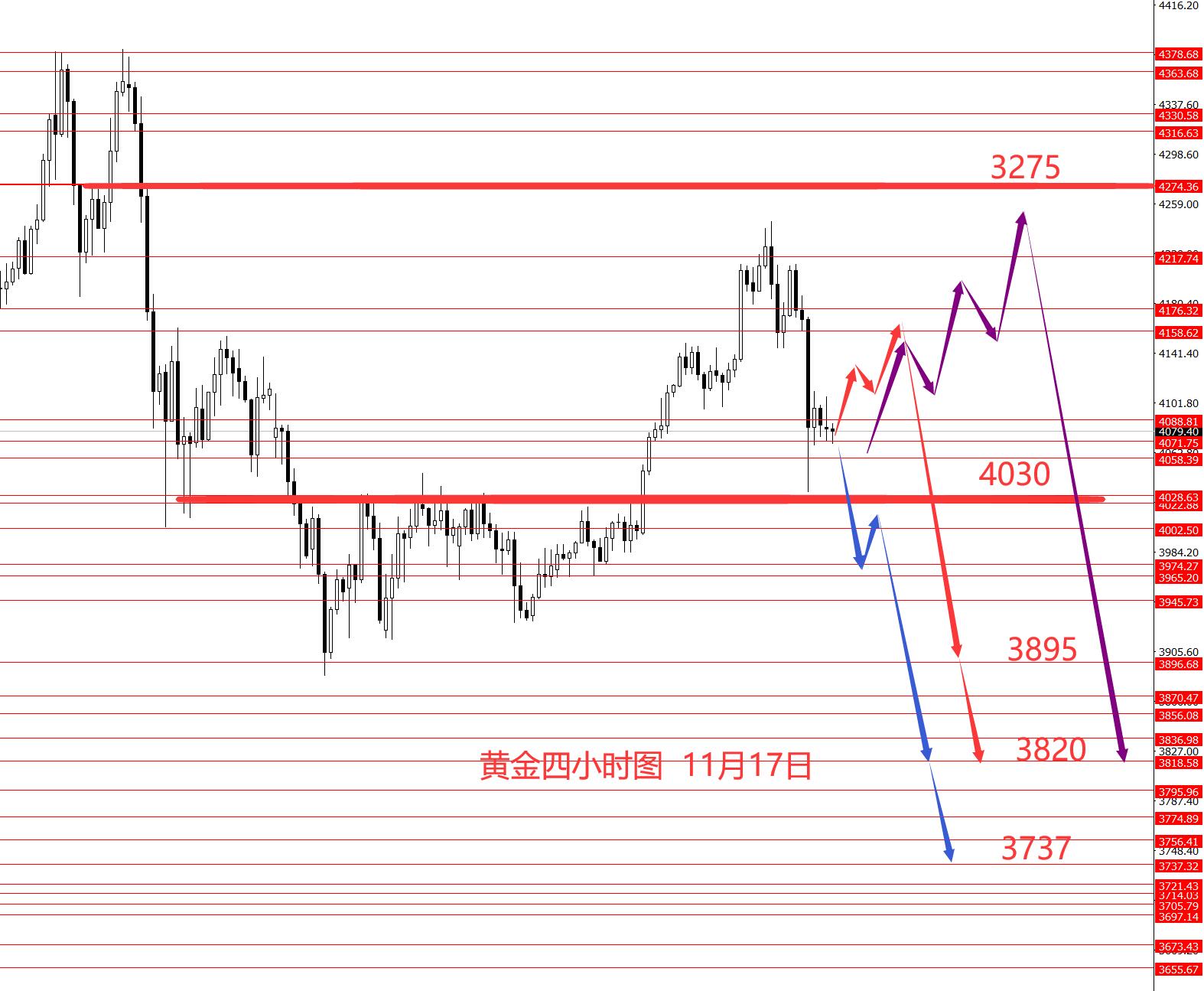 黄金前两周正如预期向上反弹,目标位4217也到位了。从图形来看,反弹到位后又承压回落,后市继续震荡下行概率较大些。11月3号讲过,黄金短期见顶了,年末收线前破前期高点4380的概率只有5%,所以未来一个半月按高位震荡或高位震荡偏空头操作。本月后市上方重点关注4275一线强阻力,以下中线看空至3820附近。本周初关注下方4030强支撑,以上黄金还得反弹再震荡震荡,至于是4160-4180区域放空,还是等待4220-4270区域放空,具体要看图形的演变情况。红紫线概率较大些,蓝线为备选方案。今日只有框架思路,没法给具体操作策略,框架思路仅供参考,风险自负。