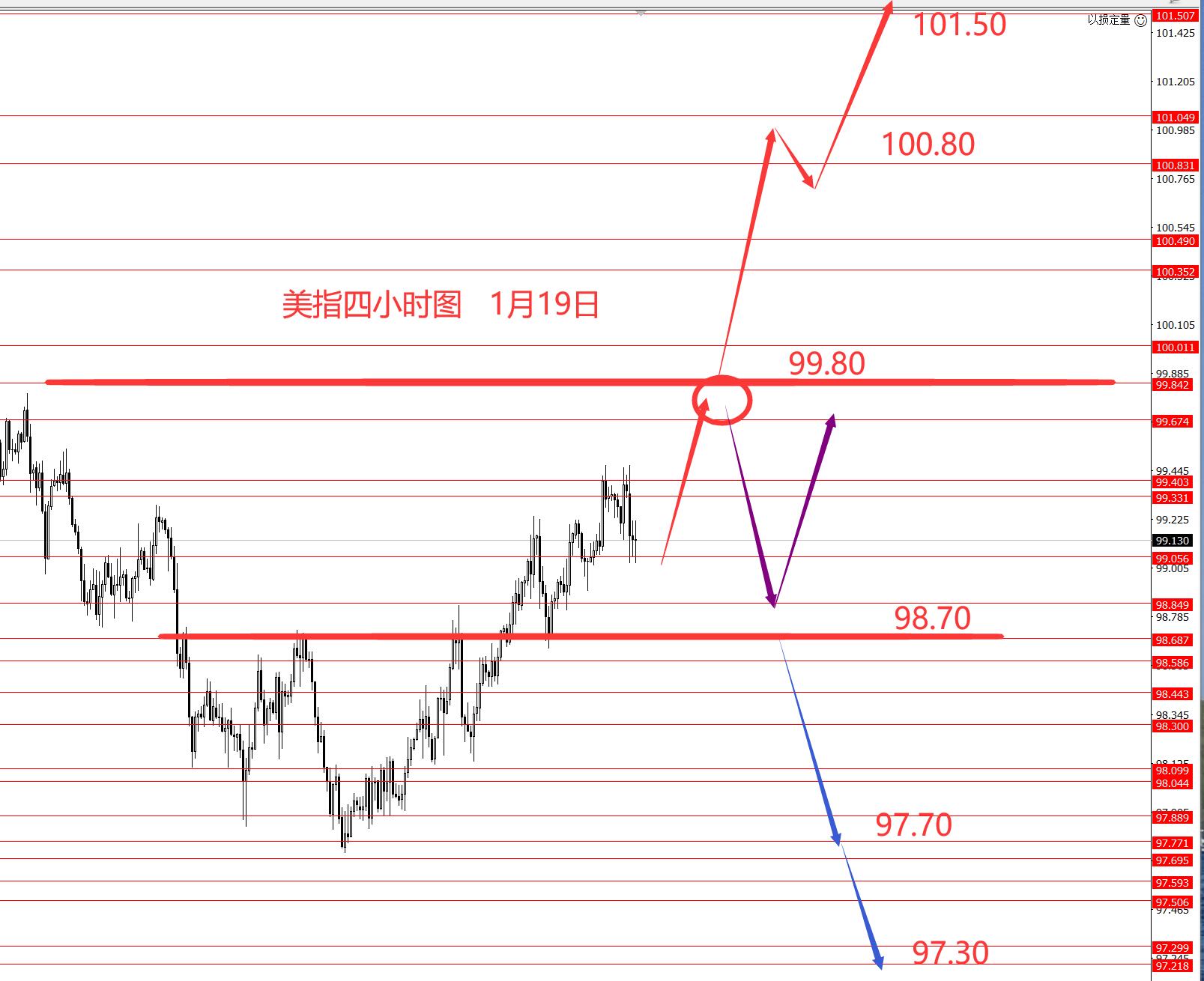 上周美指正如预期回踩98.70后向上运行,周图收阳柱。从图形来看,后市98.70以上继续看涨,波段目标102.40,本月上方重点关注99.70/99.80区域强阻力,在没成功上破前,留意再次承压下行风险;成功上破后,反弹行情将延续,看向102.40区域。所以本周先卡98.70-99.70区间行情,看如何破位,没破位前,建议按区间震荡格局偏多头操作,下破后再关注继续下行空间。本周没法给操作建议,上周持有多头的,可以提损零风险继续持有,没仓的建议观望为主。框架思路仅供参考,风险自负。