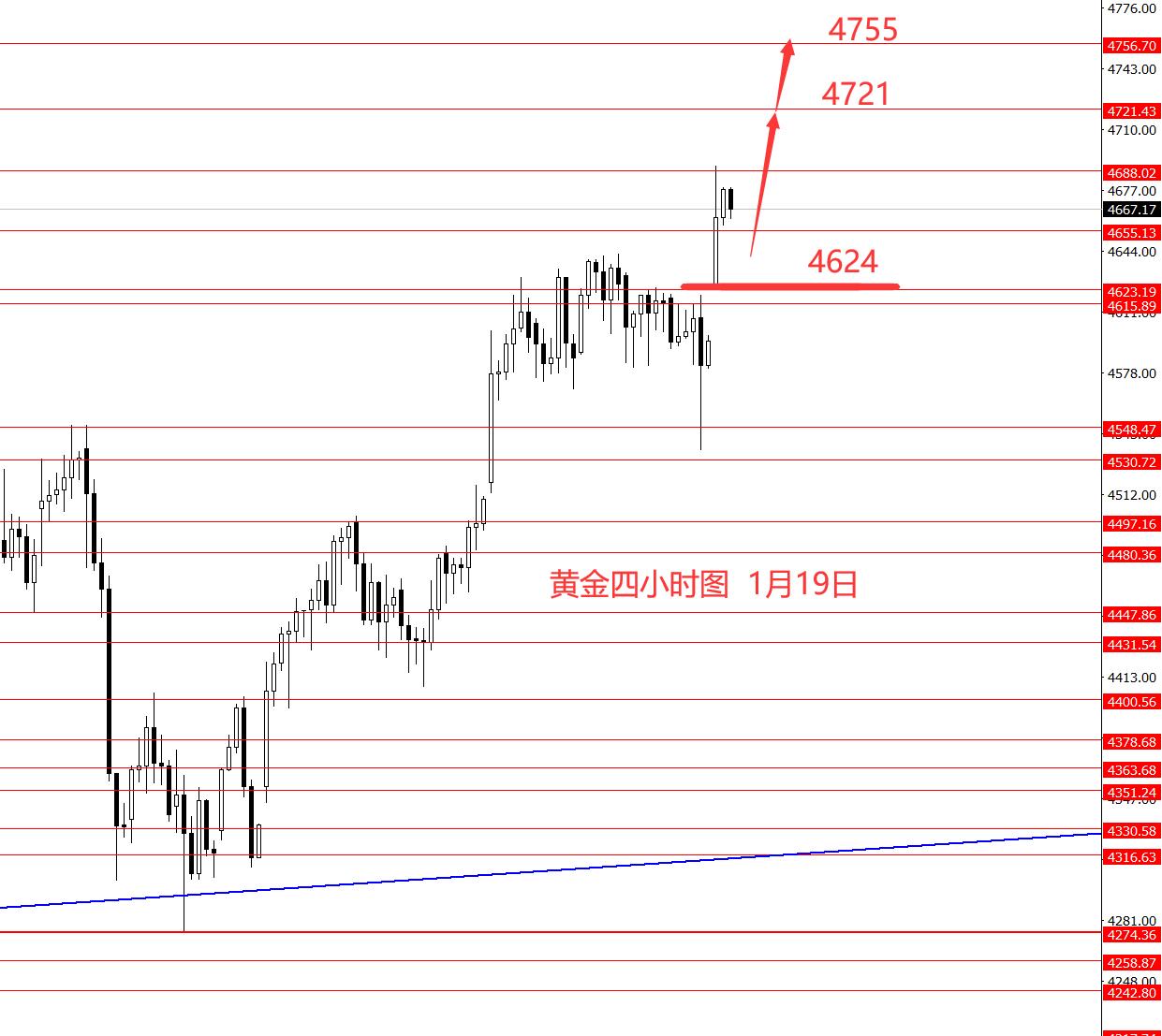 黄金上周一直接拉涨,走了红线预期,目标4688也已到位。从图形来看,黄金仍为明朗的上涨趋势,连续三周都是周一跳空高开高走,并创新高,所以本周后市重点关注4624今日的开盘价区域,此位置为本周目前重要强支撑,以上偏向于持续看涨,上方关注4721和4755区域阻力;若再跌回至4624下方,再去留意是否涨不动了和回调行情的出现。保守者观望,激进者操作建议:4645附近做多,止损4620,目标看向4721和4755.由于黄金持续创新高,所以此区域的多单,切记止损紧跟,防止市场短期转向。控制仓量,严格止损。
