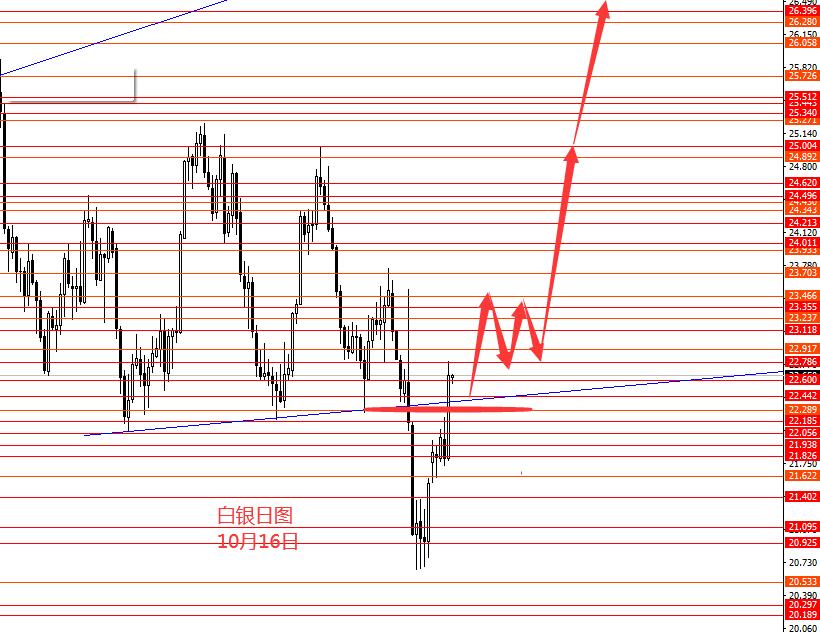 白银上周向上拉涨周图收阳,从图形来看,后市继续上行的概率较大些,上周一框架思路延用即可。本周关注下方22.30区域强支撑,以上继续看涨,上方关注23.60区域,再看向25和28区域。若要做多,建议止损摆放于上周五低点下方即可,再大的止损没必要。思路仅供参考,风险自负。