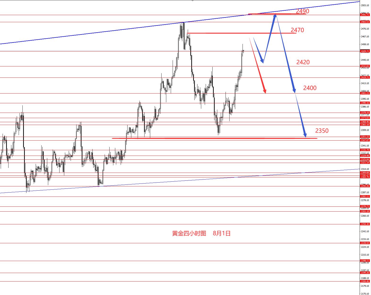 黄金正如预期在2432附近承压下行,最低2352,每天解盘一直在说月末前跌破2350的概率非常非常小也符合分析预期,只是月线收盘这么高超出我的预期。预期是月线收于在2400下方,八月初再向上测试2450,行情在时间上走早了,节奏上符合节奏分析预测。本月初黄金继续小幅向上的概率较大些,上方关注2470和2490两个强阻力,看最终哪个阻力承压,承压成立后方可做空,本月黄金大概率会冲高回落加宽幅震荡,上方关注2490,下方关注2420和2400和2350区域。暂时没有具体操作建议,框架思路仅供参考吧。