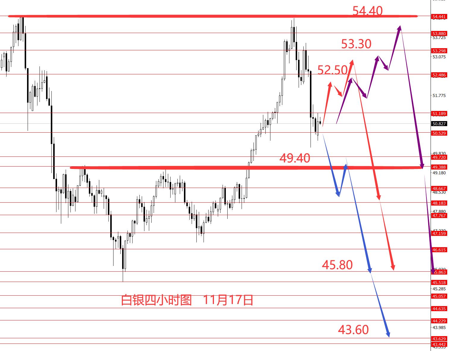 白银前两周正如预期向上反弹,且实际反弹远超预期,51.20不但到位且再次到达前期高点54.40区域才受阻力承压回落。从图形来看,白银二次在54.40区域承压受阻回落,年末前再破新高的概率相对较小,所以未来一个半月按高位震荡格局操作。节奏上同黄金一样,下方关注49.40区域强支撑,以上继续反弹震荡的概率相对较大些,在49.40-54.40区间震荡,再在这个震荡区域内去选择高空较为稳妥些,若直接跌破49.40,则为蓝线备选行情,下破后直接下行的概率将加大好多。框架思路仅供参考,风险自负。