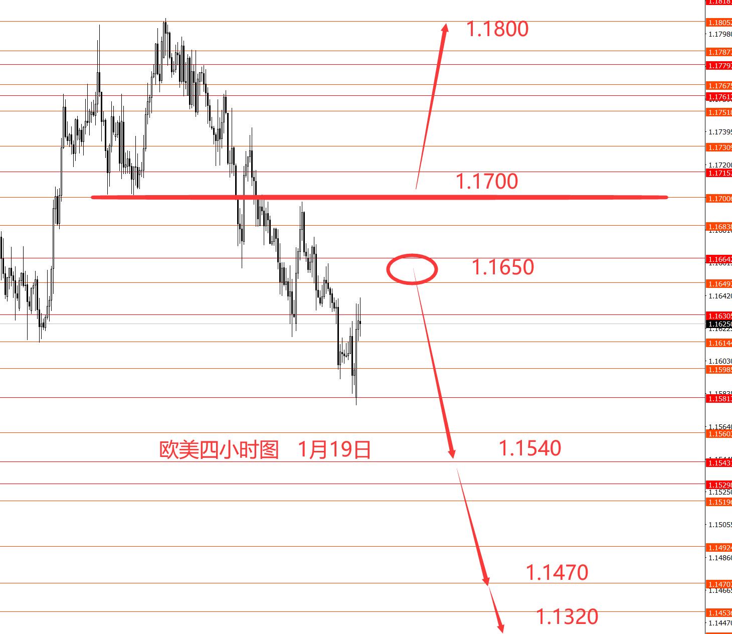 欧元上周框架思路正确,但由于周一反弹力度较大,所以建仓价偏低,如按策略执行最高刚好扫损离场。从图形来看,1.1700以下继续偏向于看空的框架不变,上周1.1580目标也已民到位,本周下方重点关注1.1540一线强支撑,成功跌破后,下跌空间将加大,波段目标1.1320区域能给到的概率将加大。本周右侧交易可关注1.1650-1.1660区域的强阻力,在此区域若再次四小时级别给出向下信号,可进场做空,止损摆放于信号源上方即可,目标1.1540和1.1470和1.1320.激进者操作策略:1.1650-1.1660区域直接给价就进,止损1.1700,目标看向1.1580和1.1540,跌破1.1540后再看向1.1470和1.1320附近。控制仓量,严格止损。