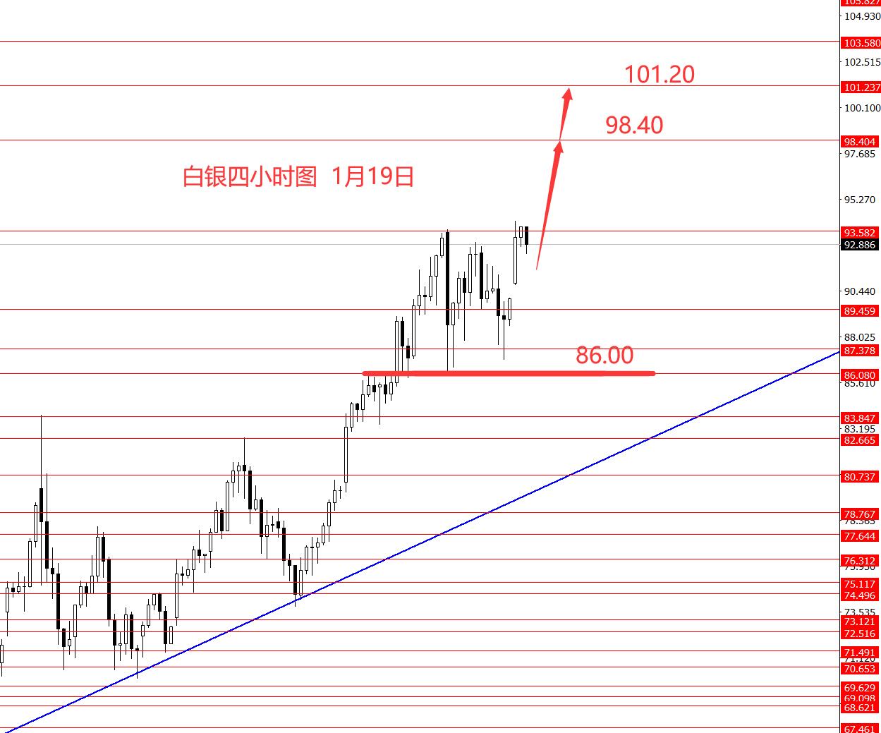 白银上周正如预期上涨,目标位89.45也已到位。从图形来看,目前还是明朗的上涨,但也要时刻留意反向行情出现。本周初继续关注上周回踩低点86.10区域强支撑,以上趋势还是偏向于看涨,但若跌破此区域,白银大概率将会回归于调整期,短时间内再创新高的概率将减小。本周保守者观望,激进者仍可逢低做多,但一定要带紧止损,防止行情短期转向。激进者轻仓尝试性操作建议:91.50区域做多,止损86.00,目标看向98.40和101.20.控制风险,严格止损。